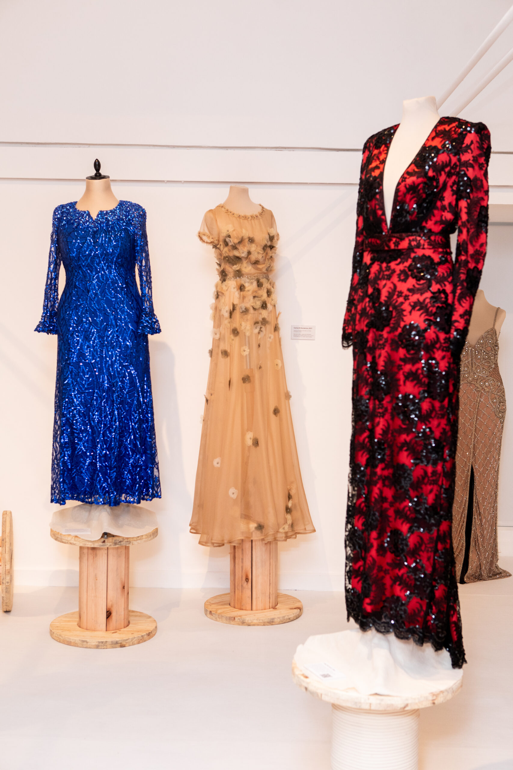Entre las piezas exhibidas, se destacan creaciones emblemáticas de grandes casas de costura nacionales, provenientes en su mayoría de la Colección Histórica del Traje Argentino que depende del Museo Histórico Nacional.