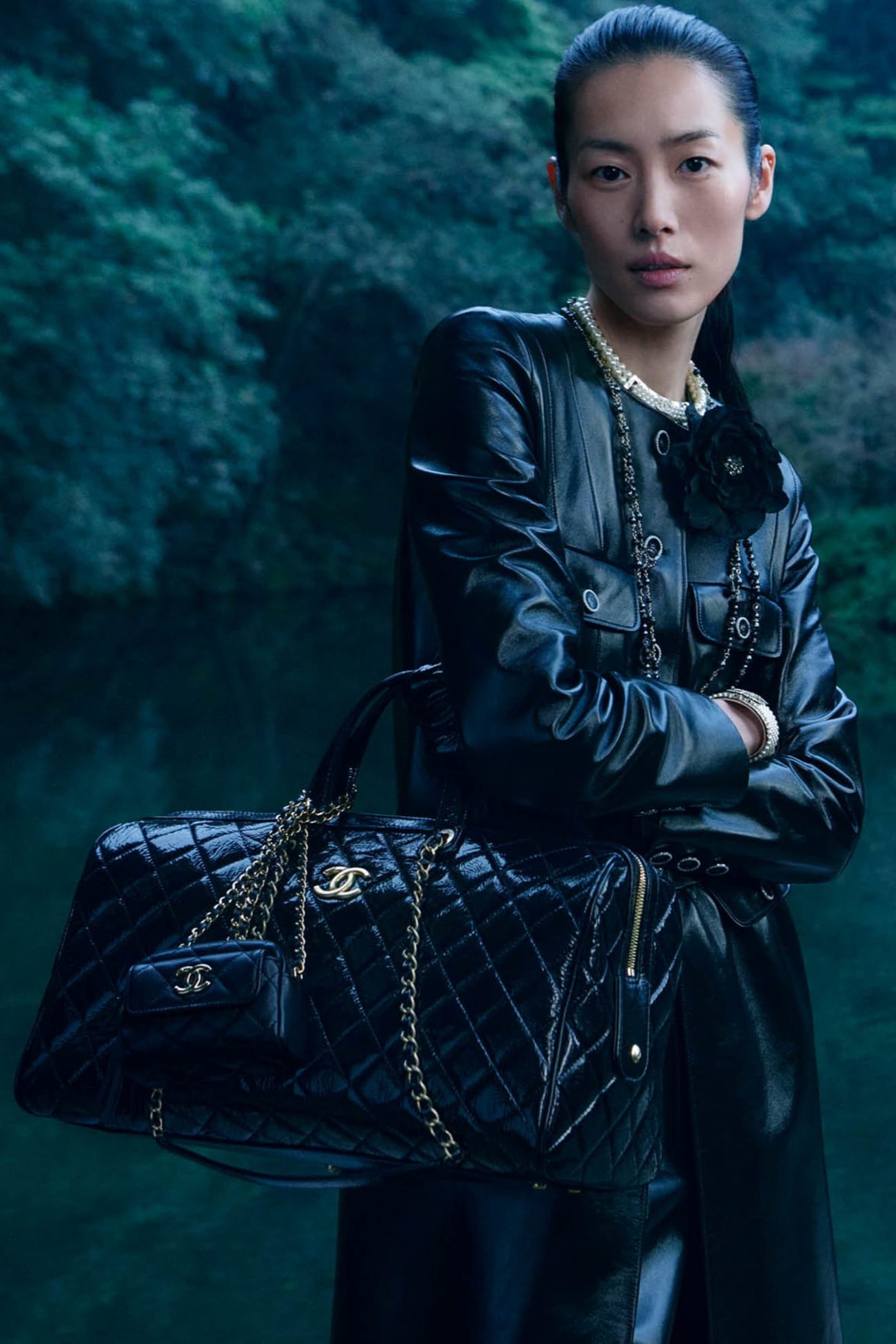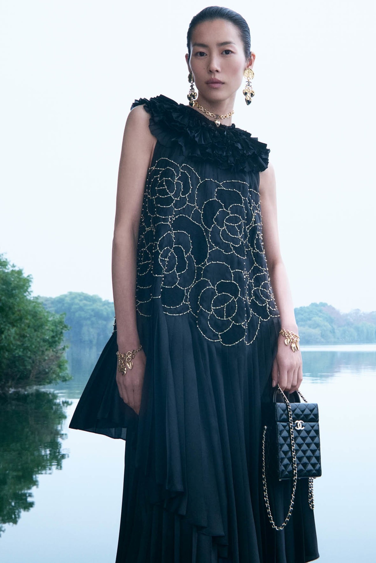 El negro domina la paleta, profundo y texturado, como en el imponente abrigo de cuero adornado con un broche de camelia de Lemarié. Liu Wen se convierte en musa nocturna con un vestido plisado de charmeuse de satén negro, realzado con bordados florales e impecables detalles de plisado artesanal a cargo de Lognon.