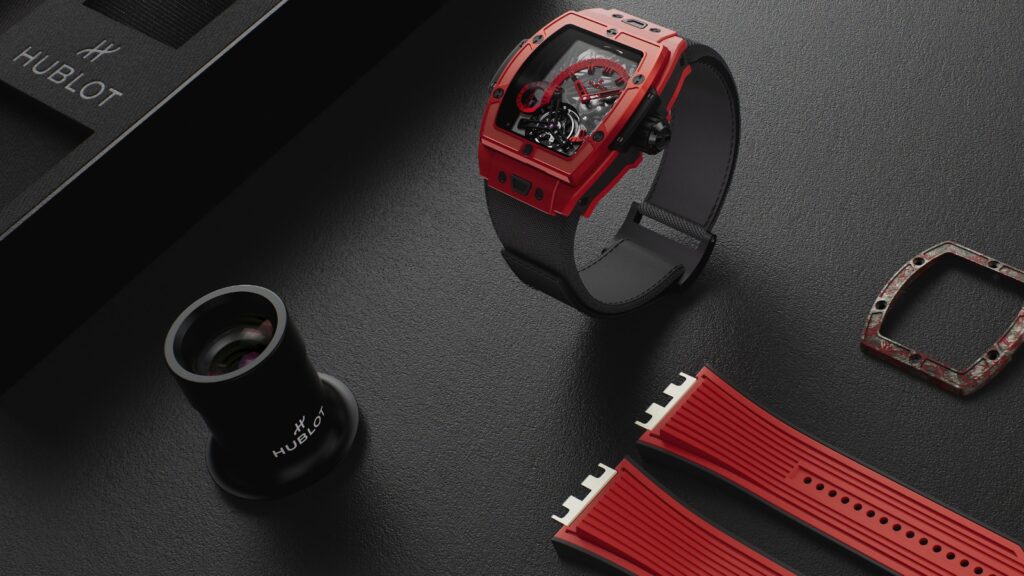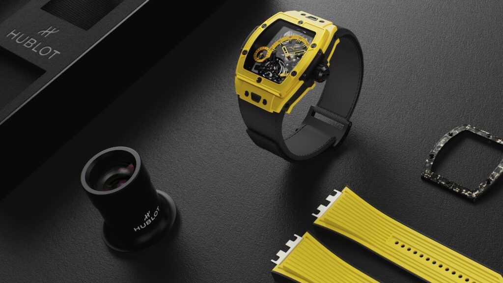 Con cuatro colores de disponibilidad inmediata: rojo, amarillo, azul celeste y negro. Todos ellos incorporan el movimiento manual HUB6020, con el tourbillon visible a las 6 h.