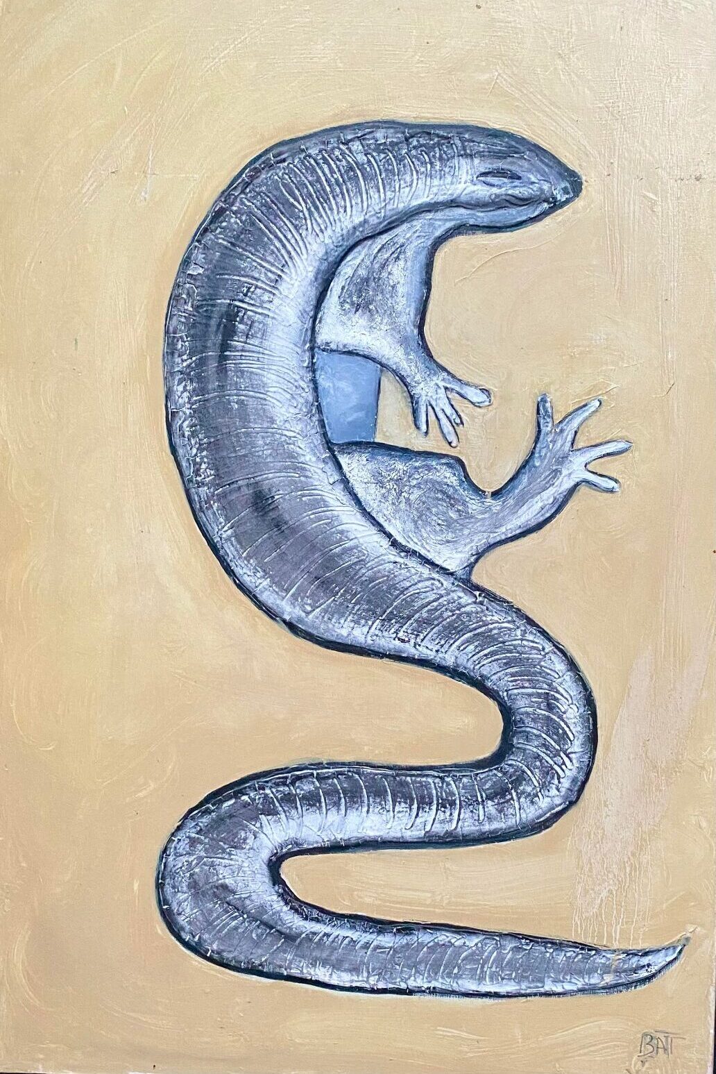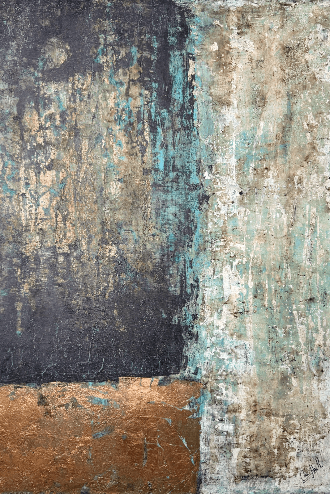 Marizu Terza investiga la materialidad como recurso expresivo central. En sus obras, la textura y el gesto adquieren protagonismo, generando superficies vibrantes donde soporte y técnica se tensionan creativamente. Su búsqueda se orienta a potenciar la experiencia táctil y visual del espectador, construyendo piezas de fuerte presencia y carácter contemporáneo.