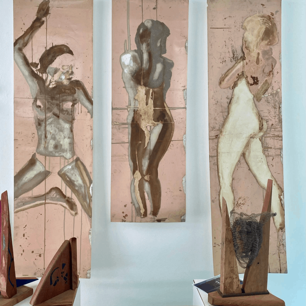 Fernanda Piamonti trabaja desde una abstracción de fuerte carga simbólica, explorando capas, transparencias y superposiciones. Presenta “ARGÉNTICA”, serie de dibujo-pintura de cuerpos desnudos que incorpora procesos de solarización mediante la activación de metales de plata y la incidencia de la luz solar. Esta técnica, vinculada históricamente a Man Ray, refuerza el carácter experimental de su producción y propone una reflexión sobre la transformación y el devenir del arte.