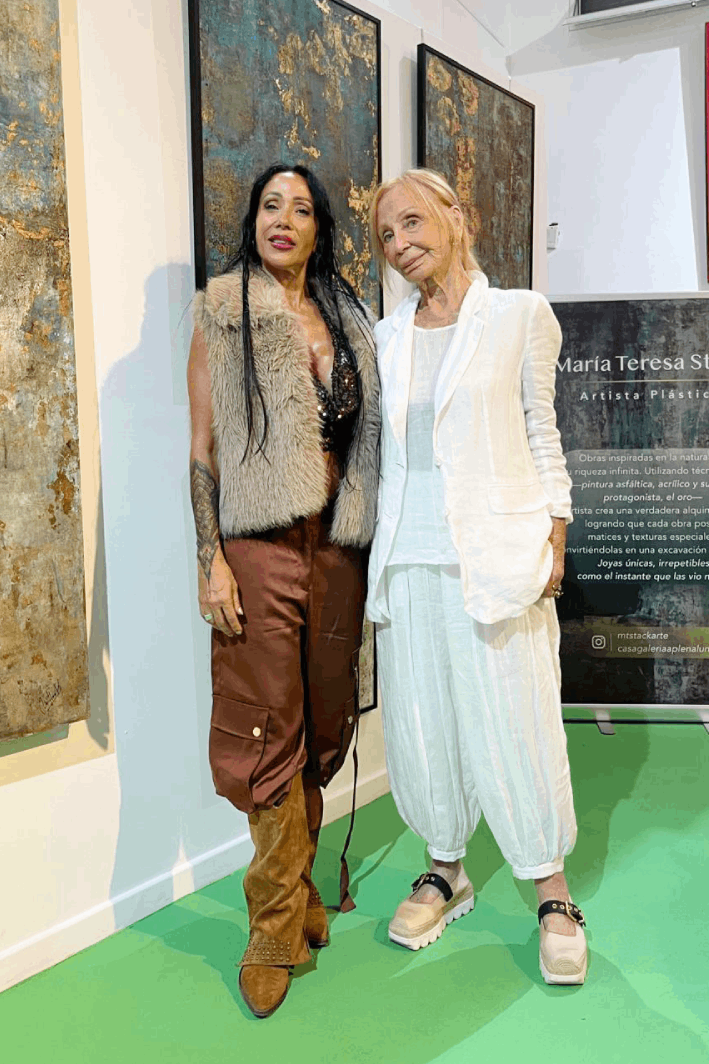 María Teresa Stack propone un diálogo entre lo figurativo y lo abstracto a través de una constante experimentación técnica. Sus obras, inspiradas en la naturaleza y su riqueza simbólica, combinan pintura asfáltica, acrílico y aplicaciones en oro, generando superficies con matices y texturas singulares. La artista construye atmósferas envolventes que invitan a una experiencia sensorial, donde color y materia se funden en una alquimia visual de gran sutileza.