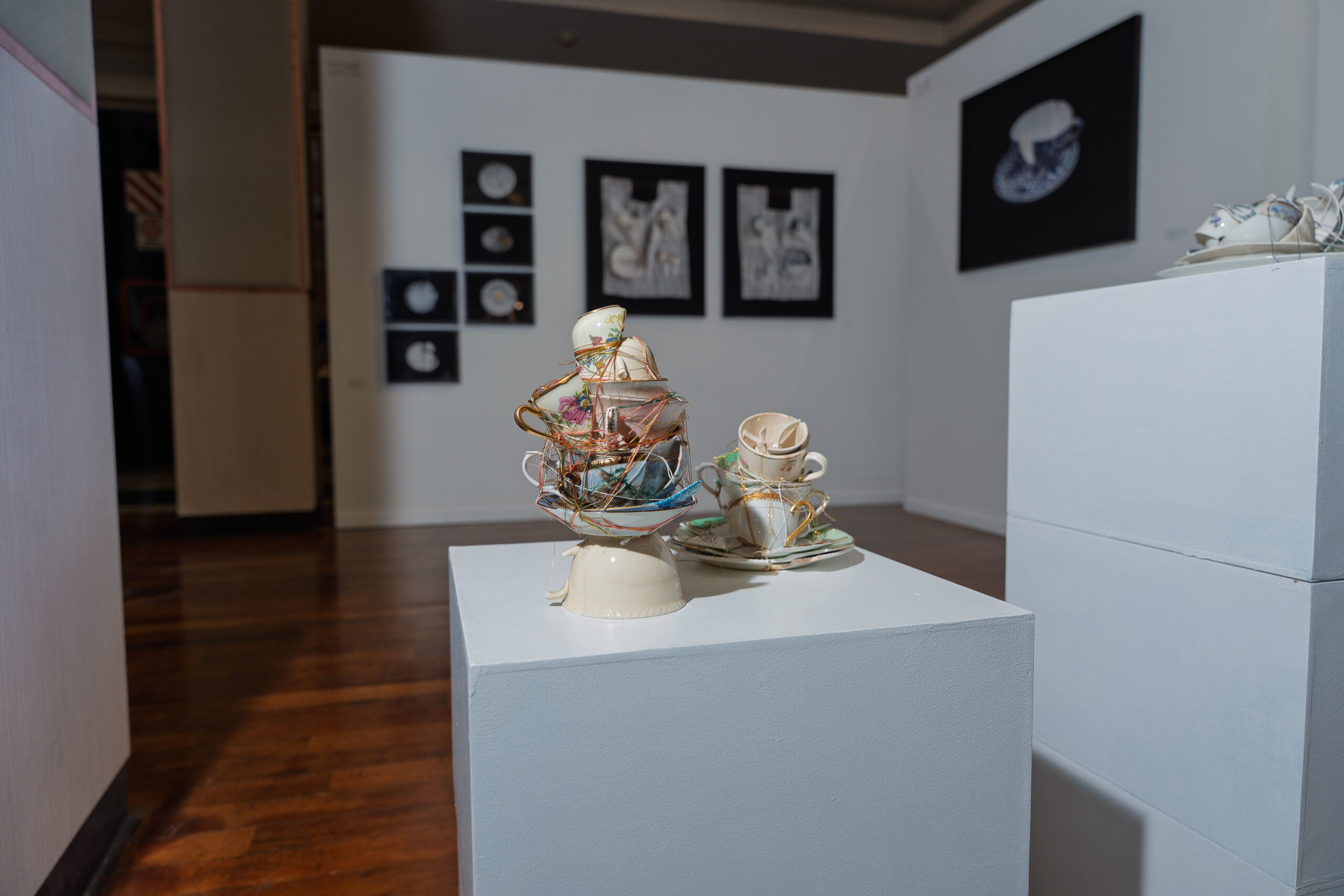 Algunas de las piezas evocan el kintsugi, técnica japonesa que repara porcelanas rotas con hilos de oro, exaltando las cicatrices en lugar de ocultarlas. En las obras de Naum, vajillas cosidas con hilos dorados se convierten en relatos de vida, memoria y sanación. “Trato de sanar algo imposible de sanar. Van a descubrir un truco: lo que parece real, no lo es”, revela la artista.